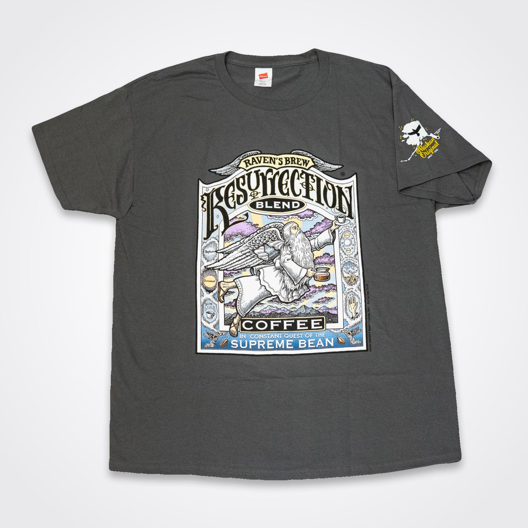 From the Book of Joe we read, “In the beginning was the WORD, and the WORD was COFFEE, and in that elixir was INSPIRATION and RAPTURE, REVELATION, and TRANSCENDENCE...” If you find you have found the Supreme Bean, then wear it on your chest with a T-shirt featuring an awesome silk-screened print of the Resurrection Blend® label art on the front and the "Alaskan Original" logo on the left sleeve..